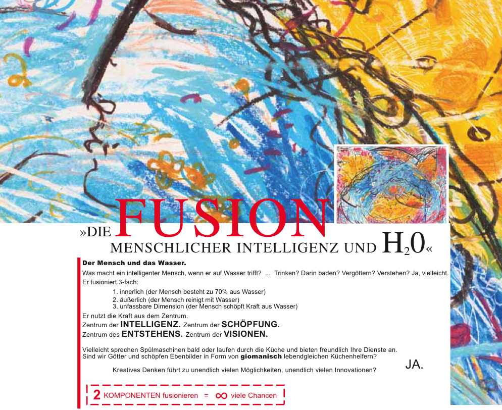 Er nutzt die Kraft aus dem Zentrum. Zentrum der Intelligenz. Zentrum der Schöpfung. Zentrum des Entstehens. Zentrum der Visionen. Vielleicht sprechen Spülmaschinen bald oder laufen durch die Küche und bieten freundlich ihre Dienste an. Sind wir Götter und schöpfen Ebenbilder in Form von giomanisch lebendgleichen Küchenhelfern?