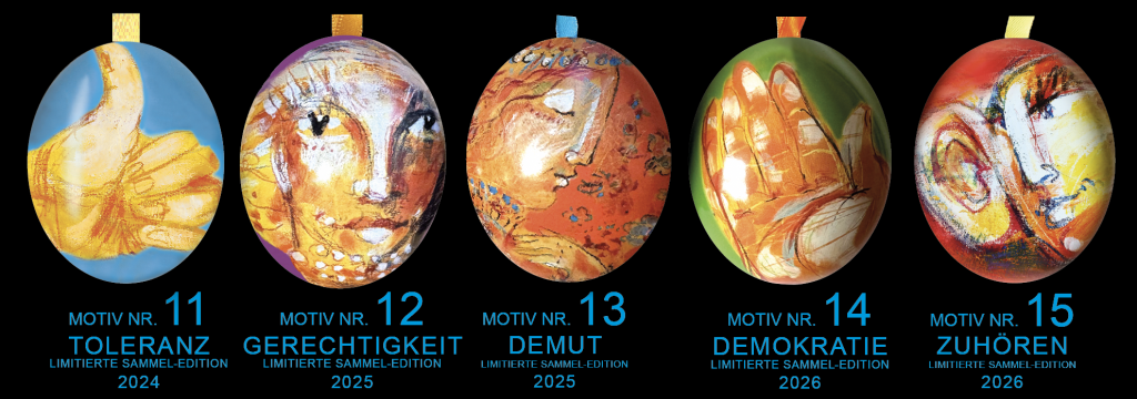 Jedes Jahr entstehen einzigartige WERTE-MOTIVE, die tausende Herzen erfreuen. Sie tragen die frohe Botschaft der VISION EUROPA in den Alltag. Ihr Kern sind die 30 Werte der EUROPÄISCHEN WERTECHARTA aus dem Leitbild VISION EUROPA von ALINA ATLANTIS®.