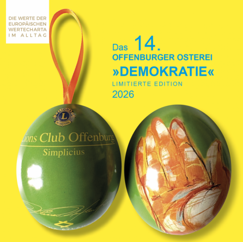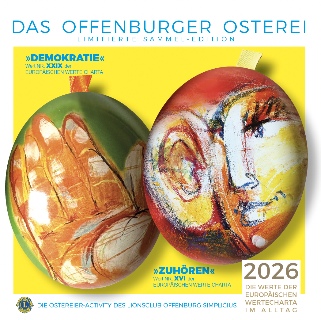 »Es ist mir ein großes Anliegen die VISION EUROPA mit ihren WERTEN in den Alltag der Europäer zu bringen. Seit vielen Jahren unterstütze ich unendgeldlich und mit großer Freude die Ostereier-Activity des LIONS CLUBS OFFENBURG SIMPLICIUS. Vielen Dank an die Lions für das wertschätzende Miteinander und für die unglaublich vielen Stunden ehrenamtlicher Arbeit für ein gemeinsames Ziel. Herzlichen Dank an alle Ostereierfans und Unterstützer für ihre Sammelleidenschaft für eine gute Sache.«